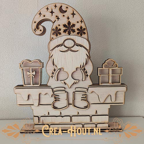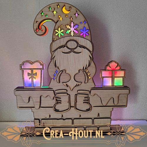 De gnome verkleed als kerstman zit rustig te wachten op een schoorsteen. Er zitten 20 led lampjes in verwerkt die op 2 AA batterijen werken (niet inclusief). De afmetingen zijn ongeveer 24,5 cm breed x 27,5 cm hoog en 4,5 cm diep. De gnome is verkrijgbaar met gekleurde lichtjes of wit licht.